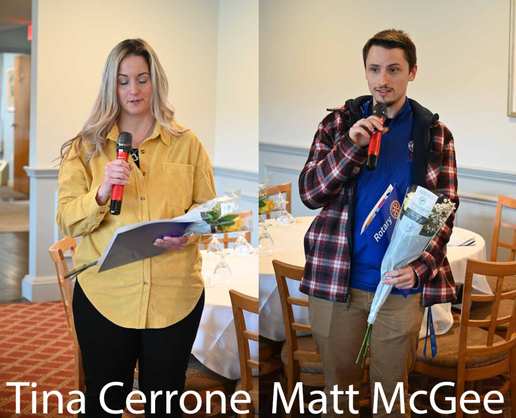 The Club was pleased to induct two new members at our meeting on Feb. 23. Tina Cerrone and Matt McGee were introduced by their sponsors Kate Marks and JoAnn Shapiro. Assistant District Governor Jen Champagned served as the MC and she spoke about Rotary generally and then invited those attending to share their “aha Rotary moment”. Many of the members provided anecdotes of special events that caused them to realize the importance of Rotary to their own life. Secretary Jeff provided pins and Rotary materials for each and Jen “pinned” each of the new members. Tina and Matt gave brief remarks and the brief ceremony concluded with each of the members of the club lining up to greet our new members. Congratulations and welcome members Tina and Matt.