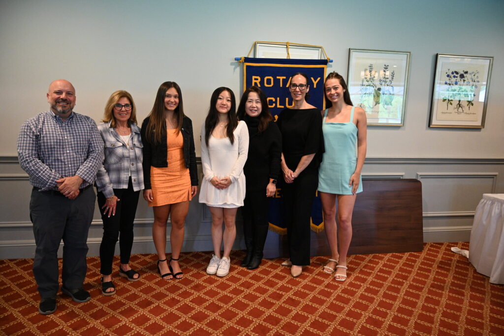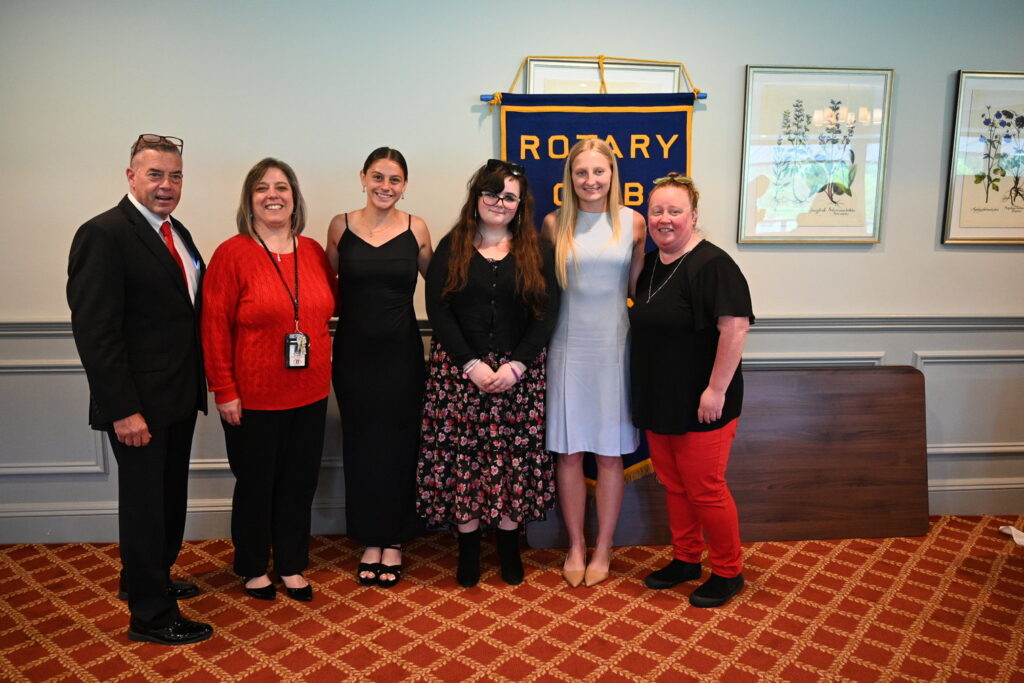 Committe Chair Ed Sheehy and Rotary President Lucy Andrade flank winners Cassie Silkoff, Quilan Gray, Syndell Cooper, Victoria Lee,Danielle Russon and Ava Bottone. Charles Pereira was not able to attend.