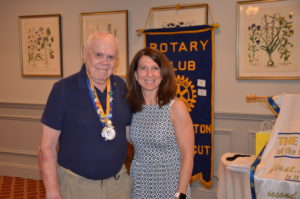 She then presented Perfect Attendance awards to 15 Rotarians who had perfect attendance during the 2018-2019 year. The number of total consecutive years of perfect attendance is shown in parentheses. They included Ernie Luise (26), Gary Sochrin(23 Kate Marks (16), Al Patuzzi (7), Kim Ryan Caro (7), Cindy Fitch (7), Jeff Forte (6), Judy Gulish (3), Jen Champagne (2), Carolyn Dowd (1), Troy Adcox (1), Tom Wilson (1), Stever Balogh (1) John Scott (1) and John Zseller (1).