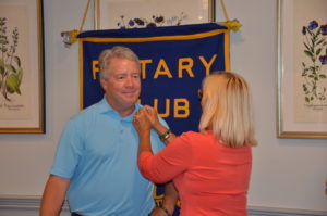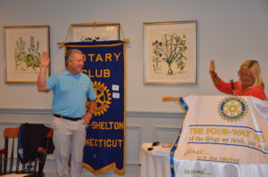 After a break for dinner, it was time to install the new slate of officers headed by President Tom Wilson. Derby-Shelton member and Assistant District Governor Cindy Fitch did the honors by swearing tom in and presenting him with his president’s pin.