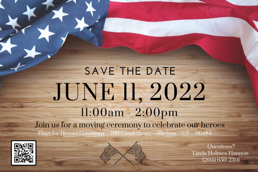 Flags for Heroes CelebrationJune 11, 2022 (updated on May 30, 2022) When 06/11/22 11:00 AM - 2:00 PM Add To Calendar Download ICS Google Calendar iCalendar Office 365 Outlook Live Where Veterans Memorial Park 38 Canal St E, Shelton, CT, 06484 Loading Map.... Veterans Memorial Park38 Canal St E - SheltonEvents 41.3153793 -73.0898401