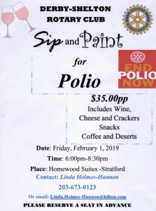 Looking for an exciting night out to break up the monotony of the long winter? Then Derby-Shelton Rotary Club’s Sip and Paint for Polio night is just for you. On Friday night February 1 just bring along your creative juices and our expert will help you walk away with a masterpiece of your own creation! We supply the canvas, the paints and enough constructive help to speed you on your way. And during the course of the evening, we’ll have plenty of snacks to eat and wine to sip to help create just the right mood!